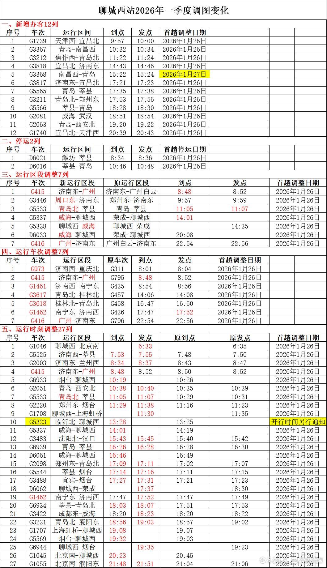 齐鲁晚报.齐鲁壹点谢晓丽 2026年铁路春运自2月2日起至3月13日结束,为期40天。记者从聊城西站了解到,为更好满足旅客出行需求,聊城西站日前已完成第一季度列车运行图 调整,并将在春运期间增开临时客车,推出一系列便民服务措施。 据了解,本次运行图调整将于1月26日起实施,聊城西站在现有开行72趟列车的基础上,新增5对共10列旅客列车,具体为:天津西—宜昌北1对 G1739/40次、济南东—宜昌北1对G3817/8次、青岛—南昌西1对G3367/8次、焦作西(郑州东)—青岛北1对G3211/2次、莘县—青岛1对G5565/6次。此次 调图亮点包括:新增前往宜昌北的两趟列车,大幅提升湖北方向运能;开行至南昌西的列车,填补了聊城高铁直达江西省的空白。此外,自1月26日 起,原通过聊城西站的威海—武汉G2081次、青岛—西安北G2063次两趟列车将新增停站并办理客运业务。 | 、新增办客12列 | | | | | | | | | --- | --- | --- | --- | --- | --- | --- | --- | | 序号 | 车次 | 灰行区间 | 到点 | 发点 | 首趟调整日期 | | | | 1 ...