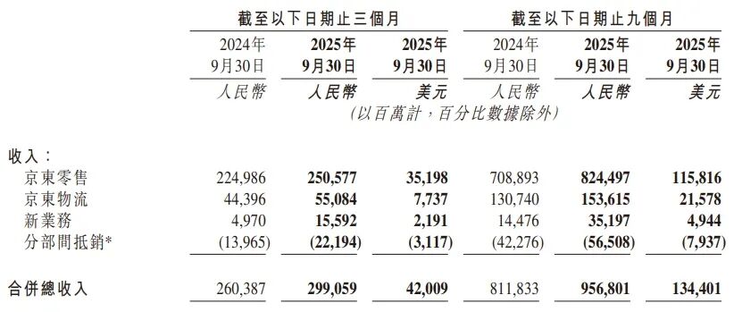 亿欧最新获悉,在双11战报发布仅两日之后,京东于11月13日港股盘后公布其2025年三季报。 财报显示,2025年第三季度,公司实现收入2991亿元,同比增长14.9%;归属于本公司普通股股东的净利润为人民币53亿 元,同比下滑120.8%;每股美国存托股摊薄收益为3.39元(0.48美元)。 详细观察各板块表现,报告期内京东零售实现收入2505.8亿元,京东物流实现收入550.84亿元,包括外卖在内的新业务实现 收入155.9亿元。 | | | 截至以下日期止三個月 | | | 截至以下日期止九個月 | | | --- | --- | --- | --- | --- | --- | --- | | | 2024年 | 2025年 | 2025年 | 2024年 | 2025年 | 2025年 | | | 9月30日 | 9月30日 | 9月30日 | 9月30日 | 9月30日 | 9月30日 | | | 人民幣 | 人民幣 | 美元 | 人民幣 | 人民幣 | 美元 | | | | | (以百萬計,自分比數據除外) | | | | | 人: | | | | | | | | 京東零售 | 224.986 | ...