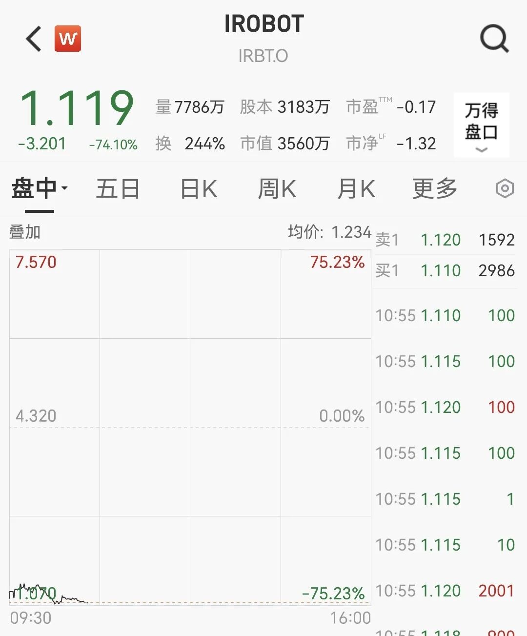 | 记者丨雷若馨 | | | --- | --- | | 编辑丨孙超逸 | | | 12月15日, 美股 | iRobot Corporation开盘暴跌69%,触发临时停牌。截至23:55,跌幅扩大至74%。 | | ( W | IROBOT | | | --- | --- | --- | | IRBT.O | | | | 1 1 1 9 量 7786万 股本 3183万 市盈™ -0.17 | | 万得 | | -3.201 -74.10% 换 244% 市值 3560万 市净" -1.32 | | 홈 □ | | 盘中・五日 日K 周K 月K 更多 ◎ | | | | 叠加 均价: 1.234 卖1 1.120 1592 | | | | 7.570 75.23% 买1 1.110 2986 | | | | 10:55 1.110 100 | | | | 10:55 1.115 100 | | | | 4.320 0.00% | | 10:55 1.120 100 | | 10:55 1.115 | | 100 | | 10:55 1.115 | | 1 | | 10:55 1.115 | | 10 | ...