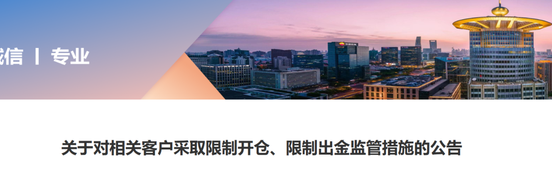 Core Viewpoint - The company has implemented regulatory measures to restrict certain clients from opening new positions for five trading days due to excessive trading volume in a specific futures contract [1] Group 1: Regulatory Actions - The company announced that a specific client group exceeded the trading volume limit for the EC 2508 futures contract on April 28, 2025 [1] - The client's trading behavior violated the regulations set forth in the Shanghai International Energy Exchange's guidelines on abnormal trading behavior [1] - As a result, the company decided to impose a five-day restriction on the client's ability to open new positions in the relevant contract [1]