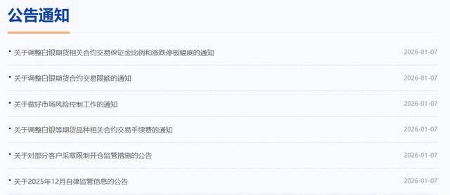 1月7日,上海期货交易所(以下简称上期所)连发多条公告提示风险、调整交易限额等。 | 公告通知 | | | --- | --- | | · 关于调整白银期货相关合约交易保证金比例和涨跌停板幅度的通知 | 2026-01-07 | | ·关于调整日银期货合约交易限额的通知 | -2026-01-07 | | · 关于做好市场风险控制工作的通知 | 2026-01-07 | | ·关于调整白银等期货品种相关合约交易手续费的通知 | 2026-01-07 | | · 关于对部分客户采取限制开合监管措施的公告 | 2026-01-07 | | ·关于2025年12月自律监管信息的公告 | 2026-01-07 | 公告称,近期国际形势复杂多变,金属品种波动较大,请各有关单位采取相应措施,提示投资者做好风险防范工作,理性投资,共同维护市场平稳运行。 同日,上期所发布关于调整白银期货合约交易限额的通知。根据《上海期货交易所风险控制管理办法》的有关规定,经研究决定,自2026年1月9日(即1月 8日夜盘)交易起,非期货公司会员、境外特殊非经纪参与者、客户在白银期货各合约的日内开仓交易的最大数量为7000手。实际控制关系账户 ...