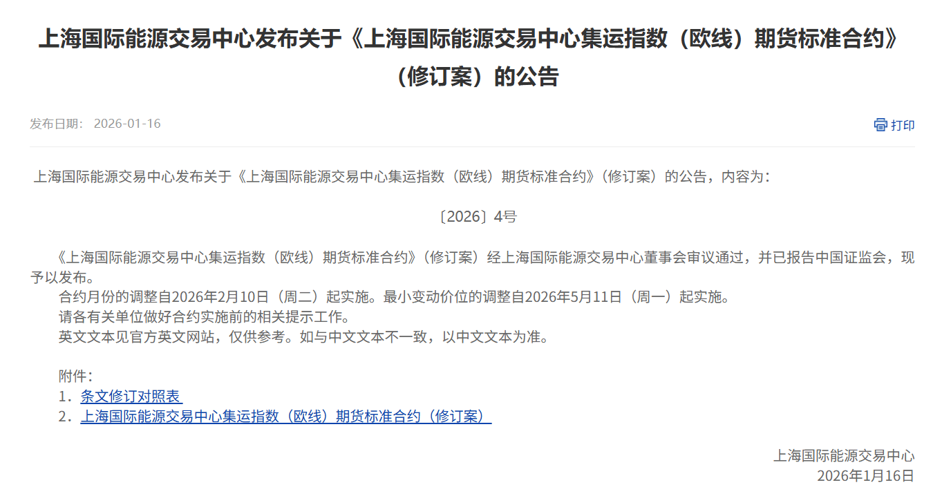 Core Viewpoint - The Shanghai International Energy Exchange announced revisions to the minimum tick size and contract month terms for the Container Shipping Index (European Line) futures, aimed at enhancing service to the shipping and foreign trade industries and improving risk management capabilities for market participants [1][2][6]. Summary by Sections Contract Adjustments - The minimum tick size is adjusted to 0.5 points, and the contract months will now include continuous months within the last six months of the year and the following two seasonal months [6][7]. - The implementation dates are set for February 10, 2026, for the contract month adjustments and May 11, 2026, for the minimum tick size changes [6]. Market Response and Functionality - The Container Shipping Index (European Line) futures have maintained active trading and stable operation since their launch, with domestic and foreign freight forwarding companies and foreign trade enterprises actively using futures for hedging [6][7]. - The revisions are based on feedback from various stakeholders, including index compilers, shipping industry chain enterprises, futures company members, and individual traders, to better meet the needs of industry clients [6][7]. Benefits of the Revisions - The change from bi-monthly to continuous month contracts is expected to narrow basis fluctuations, thereby reducing risks in industry spot and futures trading [7]. - The removal of the February contract reflects seasonal characteristics of the industry while adding nearly six months of continuous contracts to enhance overall market matching [7][8]. - The adjustments are anticipated to improve contract quoting efficiency and market participation depth, attracting a broader range of international participants and enhancing the price discovery function [8]. Future Directions - The Shanghai International Energy Exchange plans to continue optimizing contract rules to better meet market participant needs and promote effective functioning of the futures market, supporting high-quality development in the shipping industry [8].