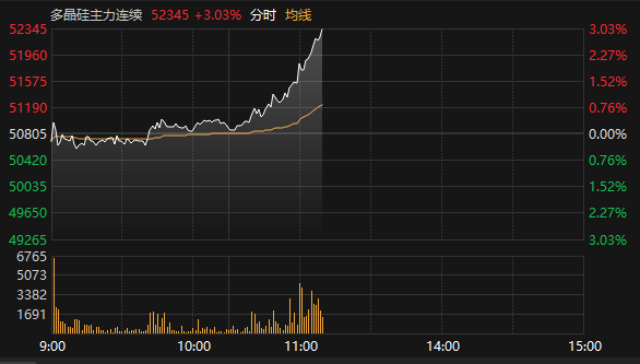 据Choice数据,10月16日,多晶硅主力合约早盘震荡拉升,截至11:10报52345元/吨,日内涨超3%。 上证报中国证券网讯 据Choice数据,10月16日,多晶硅期货主力合约早盘震荡拉升,截至11:10报52345 元/吨,日内涨超3%。 ...