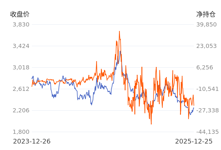 -23,716 前20期商动态:净持仓较上日减少4200手 12月25日,烧碱前20名期货公司(全月份合约加总)多单持仓16.57万手,空单持仓18.94万手,多空比 0.87。净持仓为-2.37万手,相较上日减少4200手。 据统计,近两年价格和净持仓数据的相关系数为0.68,两者存在中度正相关关系(同向性)。 数据时间2025-12-25 烧碱指数收盘价 2241.7 净持仓 烧碱主力合约机构动向: 从净多头持仓排行来看,东方财富期货以4231手净多排行榜首,日内净多头头寸增加512手,该公司品种 主力合约近一年盈利为-31,719.27万元。 净空排行方面,东证期货以9976手拔得头筹,日内净空头头寸增加2226手,该公司品种主力合约近一年盈 利为15,004.49万元。 分类 会员持仓 净持仓 净持仓增减 近一年盈利(万) | 净多 | 东方财富期货 | 4,231 | 512 | -31,719.27 | | --- | --- | --- | --- | --- | | 前三 | 银河期货 | 3,204 | 74 | 697.79 | | | 中泰期货 | 2,848 | 75 | -24,27 ...