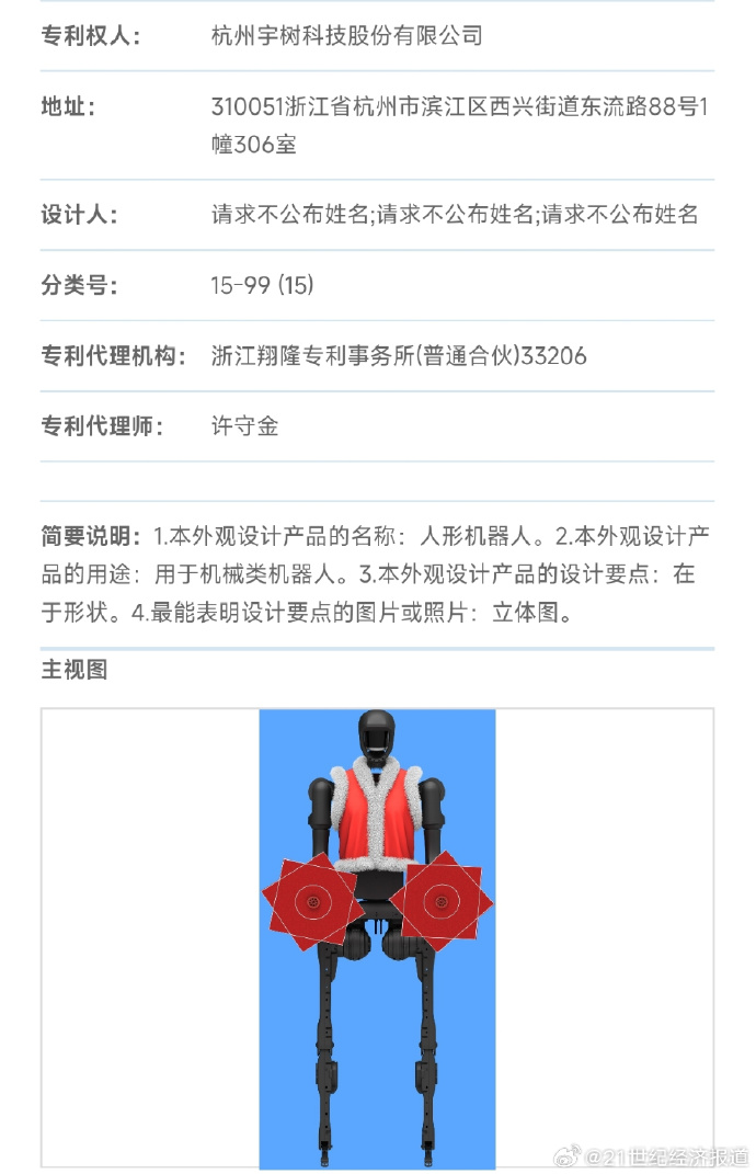 曾亮相春晚的"扭秧歌"机器人获得外观专利。近日,杭州宇树科技股份有限公司申请的人形机器人专利 获授权。专利文件中的产品图片显示,该款人形机器人身着红棉袄,"手"持红手帕,与今年央视春晚上 表演"扭秧歌"的机器人为"同款"。根据披露,该项专利为外观设计专利,产品用途为用于机械类机器 人,设计要点在于形状。 | 专利权人: | 杭州宇树科技股份有限公司 | | --- | --- | | 地址: | 310051浙江省杭州市滨江区西兴街道东流路88号1 | | | 幢306室 | | 设计人: | 请求不公布姓名;请求不公布姓名;请求不公布姓名 | | 分类号: | 15-99 (15) | | 专利代理机构: | 浙江翔隆专利事务所(普通合伙)33206 | | 专利代理师: | 许守金 | 68 @21世纪经济报道 ...