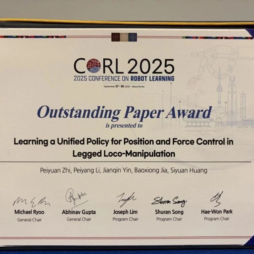 国际机器人学习大会( Conference on Robot Learning, CoRL )是全球人工智能与机器人领域的顶级学 术会议之一,其研究成果直接引领机器人学习方向的技术前沿。近年来,伴随具身智能热潮的兴起,机器人学 习领域的关注度持续攀升, CoRL 会议也成为全球顶尖团队展示核心突破的关键平台。 在 2025 年 CoRL 会议上,大会共计收到近千篇投稿,经过严格评审,最终收录 264 篇论文 。 其中, 北 京 通 用 人 工 智 能 研 究 院 团 队 的 论 文 " UniFP: Learning a Unified Policy for Force and Position Control in Legged Loco-Manipulation " 从全球顶尖研究中脱颖而出,成功斩获大会最高奖项 —— 杰出 论文奖 。 这一成果具有里程碑意义,是 CoRL 会议创办以来,首次由全中国籍学者团队摘得该奖项,标志 着中国在机器人学习与具身智能领域的研究已跻身全球领先行列。 ▍ UniFP : 足式机器人首个力 - 位统一控制算法 本研究的核心成果是提出了 UniFP ( Unified Fo ...