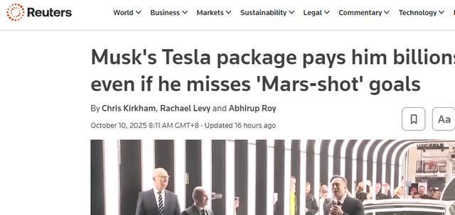 来源:环球网 【环球网科技综合报道】据路透社10月10日报道,近日,特斯拉董事会为其CEO埃隆·马斯克提供的天 价薪酬方案引发广泛关注。这份号称企业史上规模最大的高管薪酬方案,虽设定了看似高不可攀的"火 星任务级里程碑",但深入分析却发现,马斯克即便未达成大部分目标,仍可能收获巨额财富。 不过,路透社认为,马斯克最难达成的或许是利润目标,这是没有解释空间的标准。董事会设定了八项 利润目标,要求公司息税折旧及摊销前利润(EBITDA)达到的目标介于500亿美元到4000亿美元,而特斯 拉2024年的利润仅为166亿美元。此外,特斯拉目前还面临电动汽车业务恶化、新车型失败的困境。不 过,马斯克的薪酬结构允许他在未达成利润目标时获得巨额薪酬,每个目标与市值增长结合都提供相同 股票薪酬。每项目标结合市值增长都能带来相同的1%股票报酬。举例而言,马斯克实现相对容易的汽 车销量和FSD软件订阅目标所获报酬,与将利润提升五倍至800亿美元所获报酬完全相同。(旺旺) 路透社报道称,董事会要求马斯克在机器人技术、自动驾驶、股票市值和利润等多方面"彻底改变特斯 拉和社会",否则将"一无所获"。然而,路透社对绩效目标及多位专家的分 ...