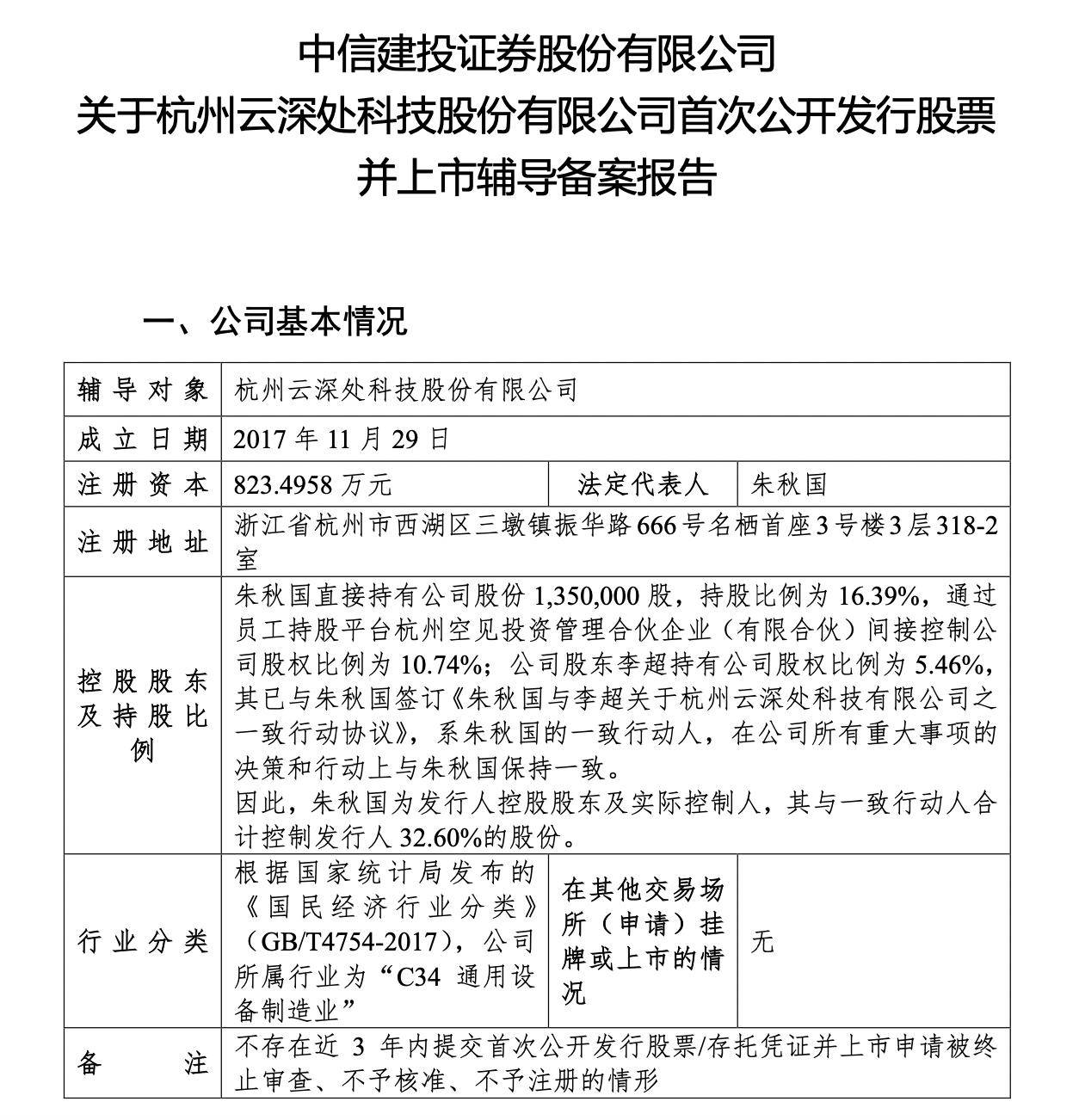 瑞财经 吴文婷12月23日,杭州云深处科技股份有限公司(以下简称"云深处科技")启动IPO。 | 辅导对象 | 杭州云深处科技股份有限公司 | | --- | --- | | 成立日期 | 2017年11月29日 | | 注册资本 | 法定代表人 朱秋国 823.4958 万元 | | 注册地址 | 浙江省杭州市西湖区三墩镇振华路 666号名栖首座3号楼3层3 | | | 室 | | 控股股东 | 朱秋国直接持有公司股份 1,350,000 股,持股比例为 16.39%, | | | 员工持股平台杭州空见投资管理合伙企业(有限合伙)间接控 | | | 司股权比例为10.74%:公司股东李超持有公司股权比例为 5.4 | | 及持股比 | 其已与朱秋国签订《朱秋国与李超关于杭州云深处科技有限公 | | 例 | 一致行动协议》,系朱秋国的一致行动人,在公司所有重大事 | | | 决策和行动上与朱秋国保持一致。 | | | 因此,朱秋国为发行人控股股东及实际控制人,其与一致行动 | | | 计控制发行人 32.60%的股份。 | | 行业分类 | 根据国家统计局发布的 在其他交易场 所(申请) 挂 元 脾或上市的情 ...