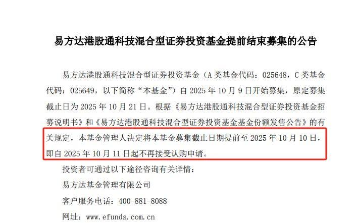 在国庆中秋长假后的首个交易日,易方达港股通科技基金迎来首发,该产品募集上限为20亿元。刚刚,该基金宣布提前结募并启动末日比例配售。这也意 味着,募集仅2个发行日,产品吸金超过20亿元。 【导读】易方达港股通科技基金宣布提前结募并比例配售,吸金超20亿元 A股市场走好,新基金发行市场也捷报频传。 业内人士指出,随着权益市场逐渐回暖,主动权益类产品重新受到投资者的关注,因此该基金取得了不俗的发行成绩。同时,主动限制首发规模,更利于 保护投资者利益。 实际上,近期新基金频频提前结募,仅9月就有48只基金宣布提前结募,其中不少为权益类产品。多位业内人士认为,随着行情深入,权益类基金发行有 望持续回暖,并不断给市场带来增量资金。 又见提前结束募集 10月9日,易方达港股通科技混合基金迎来首发。10月10日,该基金就宣布提前结束募集。 "近期主动权益产品募集成绩较好,一方面是因为权益市场回暖,此类产品受到投资者重视,尤其是'实力派'基金经理管理产品;另一方面,基金托管行 的销售能力也是重要一环,拥有较好的客户基础的渠道能获得不错的发行成绩。"一位业内人士表示。 权益基金发行回暖 有望为市场带来更多增量资金 实际上,随着A ...