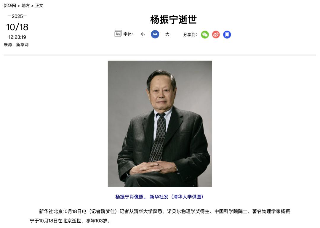 Core Insights - Renowned physicist Yang Zhenning passed away on October 18, 2025, in Beijing at the age of 103, shortly after celebrating his birthday [1] - Yang Zhenning was a Nobel Prize winner in Physics, an academician of the Chinese Academy of Sciences, and held prestigious positions at Tsinghua University [3] Contributions to Physics - Yang Zhenning was known for his groundbreaking work on the "parity violation" theory, which he proposed in 1957, leading to a Nobel Prize shared with fellow scientist Li Zhengdao [3] - The "parity violation" theory revolutionized the understanding of fundamental symmetries in nature and laid the groundwork for the development of the particle physics standard model [3] - Alongside Robert Mills, Yang Zhenning developed the "Yang-Mills theory," a cornerstone of the particle physics standard model, which has influenced various fields of mathematics and physics [4] Impact on Chinese Science - After returning to China in the 1970s, Yang Zhenning played a significant role in advancing Chinese physics and fostering international scientific exchanges [4] - He settled at Tsinghua University in 2003, dedicating his efforts to leading basic scientific research and nurturing young talent [5] - Yang Zhenning believed his most important contribution was enhancing the self-confidence of the Chinese people through his scientific achievements [5]