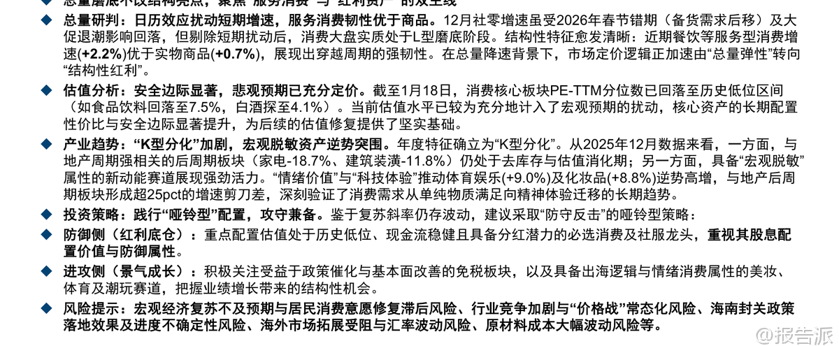 根据华金证券发布的《消费行业专题报告》,2026年初的消费市场呈现出"L型磨底"的总体态势,社零增速虽受春节错期、大促退潮等因素影响短期回落, 但剔除扰动后,消费大盘已进入底部震荡区间,结构性亮点愈发突出。 报告指出,消费市场正在加速形成"K型分化"格局——一端是具备强韧性的"极致质价比"类刚需消费,另一端则是承载"情绪价值"的高溢价精神消费,而中 间价位的传统可选消费则面临增长乏力的困境。 这一趋势深刻反映了居民边际消费倾向(MPC)修复缓慢下,中产阶级消费决策的理性回归:对非必要支出更为审慎,但在真正满足"悦己"和"社交"需求的 品类上仍愿意支付溢价。 从数据维度看,服务消费展现出显著优于商品零售的韧性。 2025年12月餐饮收入同比增长2.2%,远超商品零售0.7%的增速,"吃类"线上实物商品全年增速高达14.5%,成为支撑消费大盘的"压舱石"。 与此同时,以体育娱乐(+9.0%)、文化办公(+9.2%)和化妆品(+8.8%)为代表的"情绪消费"赛道逆势高增,与地产后周期板块(如家电-18.7%、建筑装 潢-11.8%)形成巨大反差,印证了消费需求正从物质满足向精神体验迁移的长期趋势。 估值层面,核心消 ...