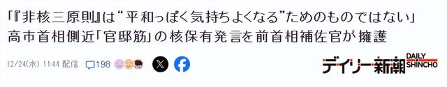 近日,日本首相官邸一名核心官员向高市早苗提议日本发展核武器的事情,在媒体曝光后引发了日本国 内以及中国等周边国家的强烈关注和不满。 然而,据日本媒体《周刊新潮》报道,多名日本自卫队前高官不仅在为日本发展核武器的言论辩护,甚 至还碰瓷起了中国和美国。 从《周刊新潮》的报道来看,碰瓷中国和美国的,分别是日本陆上自卫队前幕僚长岩田清文,以及日本 航空自卫队的退役将领织田邦男。 公开资料显示,此二人曾常年发表涉及中国台湾问题的错误言论,并妄图通过煽动恐惧中国的情绪,为 日本右翼政客推动军国主义复辟铺路。 而此次在日本发展核武器的问题上,二人一个拿被境外胡乱炒作的所谓"中国核弹头数量"说事,另一个 则以美国总统特朗普对美国战略政策的调整和收缩为由,一唱一和地鼓吹起了日本拥有核武器的"必要 性"。 不过,日本理性的网民也在努力揭露高市早苗和右翼势力这些危险的政治操弄。中国仅今年以来就多次 澄清境外有关势力对中国核武器的炒作。比如,今年6月,外交部发言人林剑就曾在回击西方一家机构 对中国核武器数量的炒作时表示,中国一直坚持自卫防御核战略,始终将核力量维持在国家安全需要的 最低水平,不参与军备竞赛。中国恪守任何时候、任何情况 ...