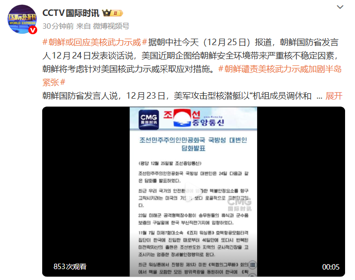 最新表态。 据朝中社今天(12月25日)报道,朝鲜国防省发言人12月24日发表谈话说,美国近期企图给朝鲜安全环 境带来严重核不稳定因素,朝鲜将考虑针对美国核武力示威采取应对措施。 谈话称,近期,美国更加露骨地表现出要给朝鲜国家安全环境永久植入严重核不稳定因素的企图。23 日,美海军攻击型核潜艇以机组成员调休和军品补充为借口,驶入韩国釜山作战基地。早在11月7日, 美海军第七舰队所属"乔治·华盛顿"号核航母战斗群进入韩国。美国战略资产时隔46天后再次出现,此 举是严重加剧朝鲜半岛和地区的军事紧张和形势不稳定的行为。 谈话提到,最近,美国在华盛顿进行"核磋商小组"第五次会议,再次确认了其动员包括核武器在内的所 有防卫力量给韩国提供"延伸遏制力"的承诺。接着美国为韩国开发核潜艇开绿灯后,把本国核潜艇武力 频繁部署到此。 谈话中还提到,朝方强力提升防卫力量来保障现在和未来的长远利益、维护安全的实践意志是坚定不移 的。朝鲜将会考虑针对美国核武力示威的应对措施,而且将以对称和非对称原则选择其实行方式和时 间。 综合自:CCTV国际时讯、央视新闻 (文章来源:证券时报) ...