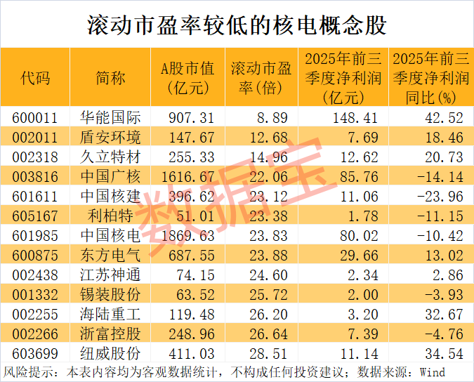 核电增长预期强劲 13只概念股最新滚动市盈率低于30倍