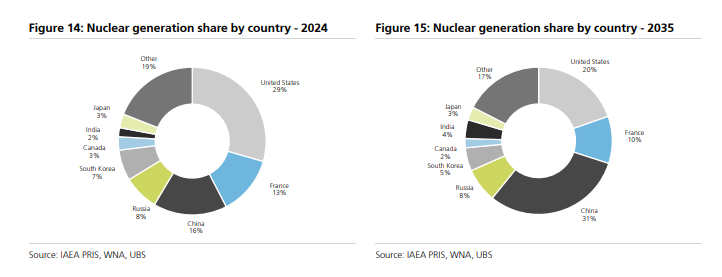 在全球能源转型与脱碳浪潮推动下,一场"核能复兴"正在酝酿。 据追风交易台消息,瑞银11月24日发布的报告《铀101:助力核能复兴》显示,作为核能关键燃料的铀——其市场正处于一个关键 的转折点。一场由"核能复兴"驱动的结构性需求浪潮,正与一个高度集中且供应受限的供给格局迎面相撞,这为铀价开启一个长 达十年的牛市周期奠定了基础。 随着全球对低碳、高基荷电力的需求日益增长,核能正重新回到各国能源政策的中心舞台。以COP28气候大会上"到2050年将核能 发电能力提高两倍"的宣言为标志,全球核电部署的强劲势头,正在从根本上改变铀的长期需求前景。瑞银预测,到2035年,全球 铀消费量将增长超过50%。 需求的地理版图正在发生深刻变化。虽然目前美国、法国等西方国家仍是核电发电量的主要贡献者,但未来的增长引擎将明确转 向东方。报告预计,到2035年,仅中国和印度就将贡献未来十年全球约四分之三的需求增长,两国在全球核能发电中的份额将从 目前的约18%翻倍至35%。 此外,以小型模块化反应堆(SMRs)为代表的新兴技术,正为铀需求开辟新的想象空间。尽管SMRs的大规模商业部署可能要到 2030年代,但其在满足人工智能数据中心等 ...