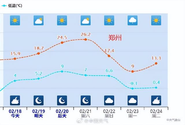 Core Viewpoint - A significant temperature fluctuation is expected in Henan, with a major warming trend followed by a strong cold front bringing rain and snow [1][6]. Group 1: Temperature Changes - A large-scale warming is anticipated across most regions of China, with temperatures rising by 15 to 20 degrees Celsius in areas from Huanghuai to the Yangtze River [1]. - On February 21, temperatures in northern and southwestern parts of Henan may reach around 26 degrees Celsius, while other areas will range from 22 to 24 degrees Celsius [1]. - The highest temperature on February 21 will contrast sharply with the lowest temperature on February 23, which is expected to drop to 9 degrees Celsius, marking a 17-degree difference [8]. Group 2: Weather Conditions - Strong winds are expected from February 19 to 20, with gusts reaching 6 to 7 levels, increasing the risk of forest fires due to dry conditions [4]. - A cold front will begin affecting Henan on the night of February 21, bringing strong winds, temperature drops, and potential sandstorms or dust [6]. - Rain and mixed precipitation are forecasted for February 22 to 23 and again from February 25 to 26, coinciding with the peak travel period for the Spring Festival [10]. Group 3: Daily Weather Forecast - February 19: Sunny with temperatures ranging from 4 to 19 degrees Celsius [11]. - February 20: Partly cloudy with temperatures from 6 to 24 degrees Celsius [11]. - February 21: Partly cloudy with a high of 26 degrees Celsius [11]. - February 22: Cloudy with temperatures dropping to a high of 16 degrees Celsius [11]. - February 23: Overcast with light rain or mixed precipitation, temperatures between 5 and 10 degrees Celsius [11]. - February 24: Partly cloudy with temperatures from 0 to 10 degrees Celsius [11]. - February 25: Partly cloudy with temperatures from 2 to 12 degrees Celsius [11].