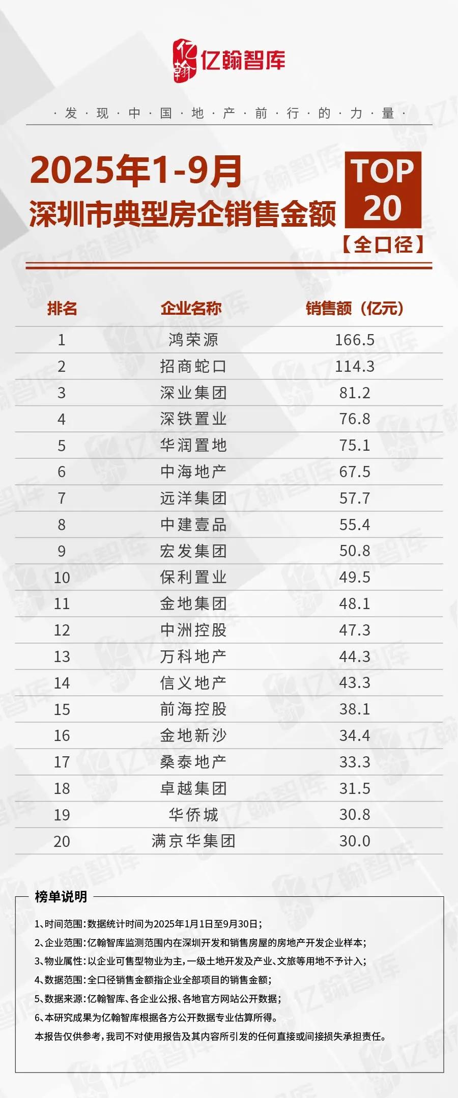 Core Viewpoint - The real estate market in Shenzhen is experiencing a significant recovery due to policy adjustments that have relaxed purchase restrictions, leading to increased transaction volumes in both new and second-hand housing markets [6][11]. Group 1: Sales Performance of Real Estate Companies - In the first nine months of 2025, the top three real estate companies in Shenzhen by sales were Hongrongyuan (16.65 billion), China Merchants Shekou (11.43 billion), and Shenye Group (8.12 billion) [5]. - The sales thresholds for the top real estate companies were set at 7.51 billion for the top five, 4.95 billion for the top ten, and 3.00 billion for the top twenty [5]. Group 2: Policy Changes - The Shenzhen government has implemented a series of measures to optimize real estate policies, including the cancellation of purchase restrictions in non-core areas and the introduction of differentiated management for corporate purchases [6][7]. - Non-resident families can now purchase up to two homes in specified areas without needing to provide proof of one year of social insurance or tax payments [7]. - The new policy also standardizes loan interest rates, eliminating the distinction between first and second home loans [7]. Group 3: Market Performance - In September 2025, the transaction volume for new residential properties in Shenzhen reached approximately 3,087 units, marking a 43.5% increase month-on-month and a 32.7% increase year-on-year [11]. - The second-hand housing market also saw a rise, with 4,546 units transacted, reflecting an 8.9% month-on-month increase and a 42.5% year-on-year increase [11]. - The inventory of pre-sold residential properties stood at 32,085 units by the end of September, with a depleting cycle of around 10 months based on the average monthly sales over the past year [9][11].
