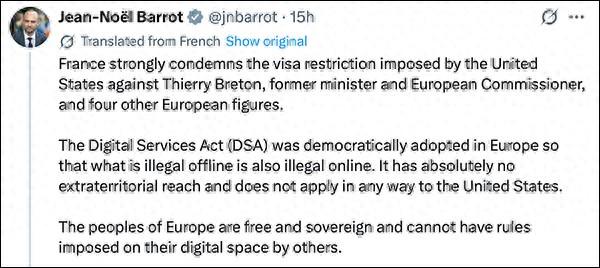 【文/观察者网 王一】美国对一名欧盟前高级官员和其他四名欧洲活动人士实施签证制裁的行为,惹怒 了法国。 在被制裁的欧盟委员会前委员、法国人蒂埃里·布雷东怒斥美国此举是"麦卡锡式的政治迫害"后,法国 总统马克龙、外交部长让-诺埃尔·巴罗12月24日也在社媒平台X上表达了强烈的谴责。 "这些措施等同于恐吓和胁迫,旨在削弱欧洲的数字主权。"马克龙言辞激烈地谴责道,"欧盟的数字监 管规则是欧洲议会和理事会在民主和主权程序下通过的。它们在欧洲范围内适用,旨在确保平台之间的 公平竞争,并不针对任何第三国,同时确保线下非法的行为在线上同样非法。欧盟数字空间的规则不应 由欧洲之外来决定。" 巴罗同样指出,"《数字服务法案》是在欧洲通过民主程序制定的,旨在确保线下非法的内容,在线上 同样非法"。他强调,该法案"完全不具有域外适用性,也绝不影响美国"。 巴罗写道,"欧洲人民是自由而且拥有主权的,不能让他人将规则强加于他们的数字空间"。 法国外交部长让-诺埃尔·巴罗发文谴责美国签证禁令。 社交媒体 法国籍欧洲议会议员拉斐尔·格卢克斯曼也在一封给美国国务卿鲁比奥的信中写道,"我们不是美国的殖 民地。我们是欧洲人,必须捍卫我们的法律、 ...