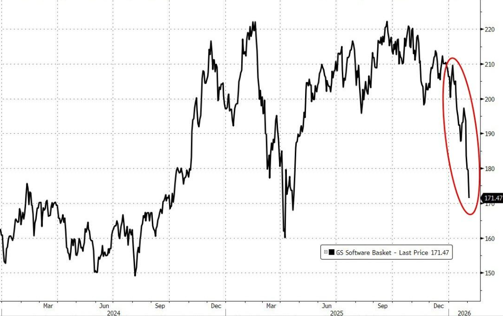 软件行业正遭遇一场由人工智能引发的生存危机,并将冲击波传导至私募信贷市场,形成危险的负反馈循环。 高盛数据显示,标普北美软件指数已连续三周下跌,1月份暴跌15%,创下自2008年10月以来最大单月跌幅。 这种恐慌情绪在本周二进一步加剧,AI初创公司 Anthropic发布面向企业内部律师的生产力工具后,法律软件和出版公司股价应声暴跌。 Jefferies股票交易部门的Jeffrey Favuzza将当前局面描述为"SaaS末日", 指出目前的交易风格完全是"无论如何让我离场(get me out)"式的恐慌性抛售 , 且尚未看到任何止跌企稳的迹象。 这一冲击并未局限于股市,正迅速传导至为软件行业提供大量融资的私募信贷领域。Barclays分析师指出,软件行业是商业发展公司(BDCs)最大的风险敞 口,约占其投资组合的20%,总规模在去年第三季度达到约1000亿美元。随着软件公司估值暴跌,Blue Owl、Blackstone和Ares等BDC股价均出现下挫。 摩根大通和高盛的分析显示,市场正在经历前所未有的分化:一边是被视为AI超级周期受益者的半导体公司,另一边是被视为最大输家的软件公司。 随着软件 股权估值 ...