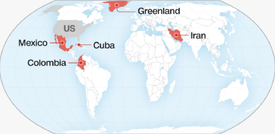 作者:蒂姆・利斯特 被捕的委内瑞拉总统尼 古拉斯・马杜罗抵达曼哈顿下城直升机机场,他将前往曼哈顿丹尼尔・帕特里克・美国联邦法院,于周 一在纽约首次出庭受审。 美国军方于周末抓获委内瑞拉总统尼古拉斯・马杜罗后,美国总统唐纳德・特朗普及其政府官员已向多 个国家和地区发出警告,其中包括哥伦比亚、古巴、墨西哥、伊朗,以及丹麦的自治领地格陵兰岛。 特朗普于周日表示:"我们致力于推动周边国家走向繁荣稳定,保障石油资源能够自由开采和流通。" 他还宣称:"美国在西半球的主导地位,将再也不容置疑。" 以下为特朗普在过去两天内的表态,以及部分相关国家政府的回应情况。 格陵兰岛 2025 年 3 月 28 日,美 国副总统 JD・万斯、第二夫人乌莎・万斯与美国军方皮图菲克太空基地指挥官苏珊・迈尔斯上校 (左)合影留念,二人当时正在该基地视察。 特朗普在周日再次强调,从国家安全角度出发,美国 "需要" 北大西洋的巨型岛屿格陵兰岛。 佩特罗随后在社交平台 X 上发布了一篇近 700 词的长文,为其政府打击毒品走私的政绩辩护,其中提 及该国实现了 "全球历史上规模最大的可卡因缉获行动"。 他在 "空军一号" 专机上对记者表示:"我们需要 ...
