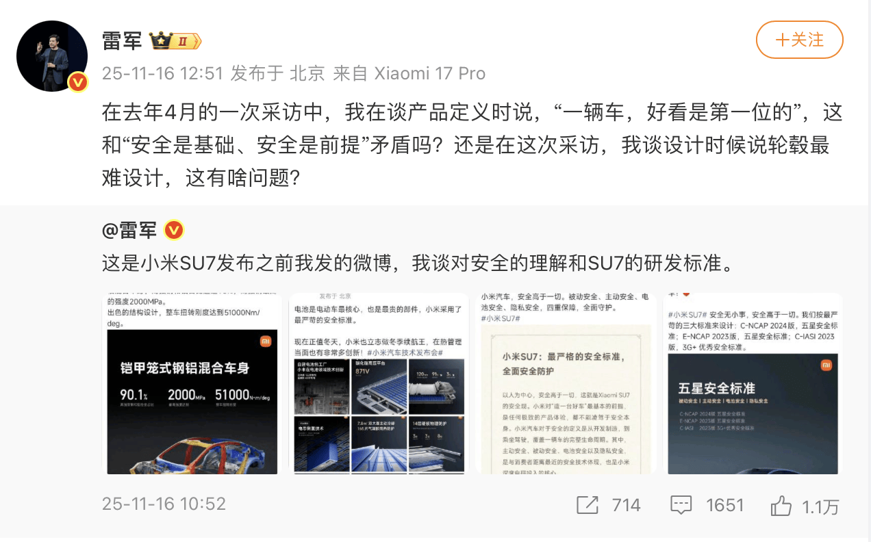 雷军连发微博谈小米汽车:好看和安全并不矛盾,有人歪曲抹黑