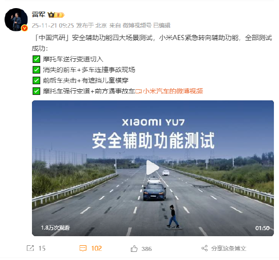 雷军:小米AES紧急转向辅助功能成功通过中国汽研四大场景测试