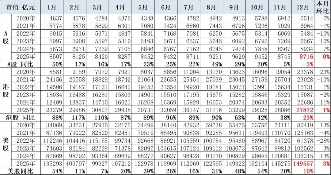 注:本分析文章仅代表崔东树个人观点,如有异议,请留言。 汽车整车上市公司市值不仅是资本市场对企业当前经营成果的定价,更是反映汽车行业趋势、技术变革与政策导向的"晴雨表"。很多整车企业都把市值管 理作为重要的工作,因此跟踪市值变化也是行业研究的重要领域。整车企业A股上市艰难,带来A股相对国际股市的竞争力较差。 世界汽车整车企业市值中,美股市场的规模最大,2025年12月份达到14.96万亿元的规模,环比11月增3%,同比增10%。而港股市场也达到了2.79万亿元 的规模,环比11月降1%,同比增23%。国内A股市场达到8716亿元的规模,环比11月降0.1%,同比降2%。在这里我们把A股港股中有些多地上市的公司市 值会按第一上市地做侧重,A股相对来说比较简单一点。 我们把中国车企和零部件企业的A股、港股、美股的三地市值汇总看,12月股票市值的汽车零部件占比47.5%(同期41%)表现较强,整车企业市值占比 48.4%(同期55.3%)的下降较快,虽然有奇瑞的加入,但市值占比仍是明显下降。 | 上市公司 | 12月市值 | 环比 | 同比 | 12个月位 | 5年位置 | | --- | --- | --- | ...