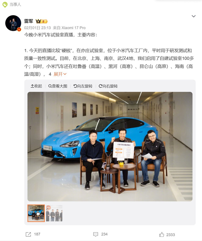 【雷军直播介绍小米汽车试验室,#雷军称预计春节前新小米SU7样车到店#】 据白鹿视频报道,2月1日,@雷军 在直播探访小米汽车试验室的环节中,同步披露新一代小米SU7的最 新研发进度。他表示,新一代小米SU7的研发工作已全部完成,目前进入量产确认阶段,首批样车预计 在春节前抵达线下门店,方便消费者到店进行静态体验后再做购车决策。#雷军直播# 雷军提到,此前因上市节奏紧凑,用户未能在发布前实地看车并提出相关意见,本次将拉长筹备与展示 周期,优化用户看车与订车流程。 直播后,雷军在个人微博总结介绍小米汽车进展:已建百余试验室、4大极端测试基地与2大综合试验 场,测试团队超800人,路测覆盖300余城、累计超2800万公里。2026年1月交付超39000辆,主力交付 YU7,工厂筹备新一代SU7。SU7以86%保值率夺2025纯电车型年度第一,新一代SU7 Max24小时耐力 赛4264km创佳绩。SU7 Ultra成首款登陆《Gran Turismo 7》的中国车型。即日起至2月28日YU7推新金 融方案与限时权益,新一代SU7研发完成,2月13日起登陆7城商场展车,机场广告同步上线。 】当事人 E-J 234 ...