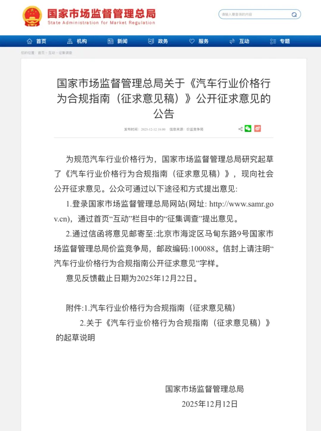 12月12日,国家市场监督管理总局介绍,为规范汽车行业价格行为,国家市场监督管理总局研究起草了《汽车行业价格行为合规指南(征求意见稿)》 (以下简称"《指南》"),现向社会公开征求意见。《指南》细化了汽车生产企业价格行为规范,明确了从整车到零配件生产、从定价策略到销售行为各 环节的价格合规要求。 12月12日晚,中国汽车工业协会专家对《指南》进行解读表示,合法、合规是企业经营必须坚守的底线。汽车生产和销售企业应建立完善的内部价格合规 管理机制,积极开展价格风险识别与预警,自觉规范非理性竞争。 国家市场监督管理总局研究起草了《汽车行业价格行为合规指南(征求意见稿)》 规范汽车行业价格行为 《指南》细化了汽车生产企业价格行为规范,明确了从整车到零配件生产、从定价策略到销售行为各环节的价格合规要求。 具体包括:一是实行全流程价格管理,要求建立覆盖整车销售、金融服务等环节全链条价格管理制度。二是规范促销与定价行为,要求返利政策清晰明确 且以合同等形式约定,尊重经销商自主定价权。三是依法打击不正当价格行为,细化了多种表现形式。四是强化公平定价约束,禁止对同等交易条件经营 者实施价格歧视,禁止生产者之间及零配件企业之间价 ...