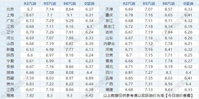 2026年1月8日,星期四 2026年第二轮油价调整周期进入第2个统计日,距离1月20日24时的调价窗口还有12天。当前周期统计工作已完成 20%,受1月7日国际油价再次大跌的影响,周期内油价预计跌幅进一步扩大,目前已处于明确的下调状态。 今日油价(2026年1月8日) 92号,95号,98号汽油,0号柴油最新油价列表如下! | | 92汽油 | 95汽油 | 98汽油 | 0柴油 | | 92汽油 | 95汽油 | 98汽油 | 0柴油 | | --- | --- | --- | --- | --- | --- | --- | --- | --- | --- | | 北京 | 6.7 | 7.14 | 8.64 | 6.37 | 天津 | 6.69 | 7.07 | 8.57 | 6.33 | | 圆 | 6.67 | 7.1 | 9.1 | 6.31 | 重庆 | 6.78 | 7.16 | 8.65 | 6.41 | | 广东 | 6.73 | 7.29 | 9.29 | 6.34 | 浙江 | 6.68 | 7.11 | 9.11 | 6.32 | | 江苏 | 6.68 | 7.11 | 9.16 ...