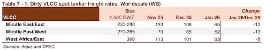 智通财经APP获悉,欧佩克在最新月度报告中表示,油轮市场在2026年开局表现积极。在地缘政治不确定性、天气干扰、计划 外停产以及稳定的装货活动的支撑下,黑油轮即期运费在1月份迎来强劲开局。VLCC即期运费在2026年初表现异常强劲,这一 势头也蔓延至较小船型。中东至东行航线的即期运费达到了至少十年来的1月最高水平,同比上涨64%。 | | Size | | | | Change | | --- | --- | --- | --- | --- | --- | | VLCC | 1,000 DWT | Nov 25 | Dec 25 | Jan 26 | Jan 26/Dec 25 | | Middle East/East | 230-280 | 123 | 108 | 85 | -13 | | Middle East/West | 270-285 | 73 | 65 | 52 | -13 | | West Africa/East | 260 | 113 | 101 | 93 | -8 | 苏伊士型油轮运费受到大西洋盆地天气干扰的支撑,以及VLCC市场的溢出效应。由于欧洲炼油商寻求替代受干扰的里海管道联 盟原油流 ...