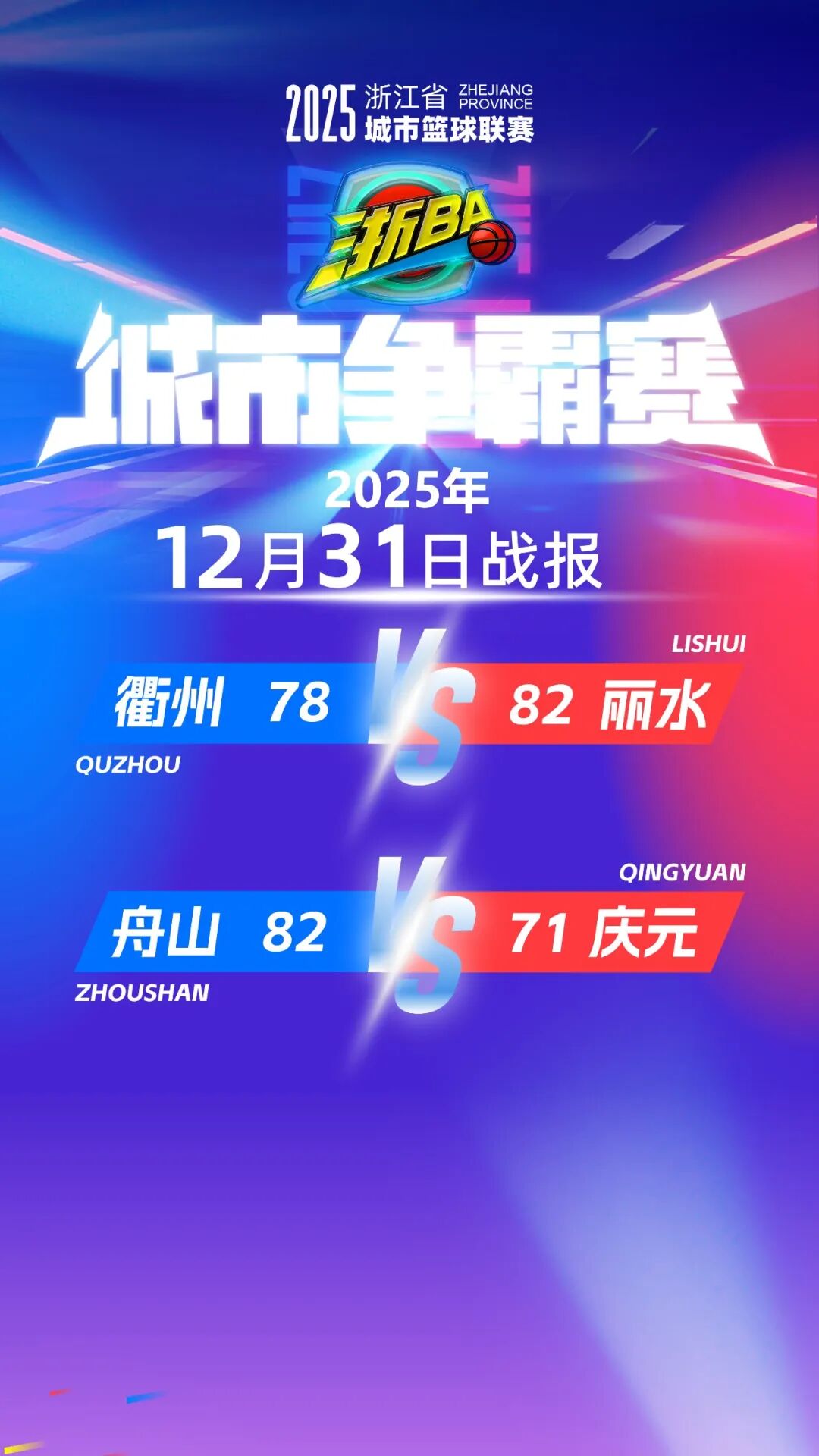 转自:浙江发布 2025年12月31日晚,"浙BA"城市争霸赛第二十一轮比赛继续进行:衢州VS丽水、舟山VS庆元。最终,丽水、舟山获胜。两场激战为2025年的"浙BA"赛 程画上圆满句号。 衢州VS丽水 比赛伊始,双方迅速进入状态,外线对飙三分球,瞬间点燃赛场氛围。此后丽水队率先发力,拿下两分。衢州队则凭借稳定的外线投射持续得分。首节战 罢,丽水队以18:23落后衢州队5分。 末节决战,丽水队进攻端全面爆发。关键时刻,倪豪凯两罚全中稳定军心,赵浩然命中关键2分,将领先优势扩大到4分。最后时刻,徐敏伟一条龙上篮得 手,彻底杀死比赛悬念。 第三节比赛开打,赵浩然率先为丽水队拿下2分,紧接着徐敏伟跳投再添2分。倪豪凯状态火热,连取4分帮助球队将分差追至6分,衢州队见状紧急叫暂停 调整。暂停归来,双方比分交替上升。第三节战罢,丽水队以60:61仅落后衢州队1分,悬念拉满。 衢州队下一场比赛将在1月9日19:30客场对阵普陀队,丽水队下一场比赛将在1月4日19:30主场对阵普陀队。 舟山VS庆元 舟山队开场便展现出更好的整体性,通过流畅的传导球多次找到空位机会。5号毛振宇在内线频频得手,24号张哲瑜也命中三分。庆元队则 ...