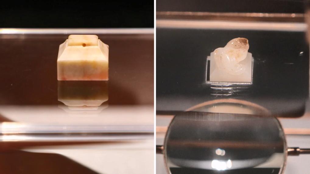 0:00 这个"十一" 南昌汉代海昏侯国遗址博物馆 来新嘉宾了 隔壁的南越国带着宝贝来"串门"了 这次跨时空相遇 将会带来哪些惊喜 新华社记者邀请到 南昌汉代海昏侯国遗址博物馆副馆长范丽君 带您一探究竟 南越国和海昏侯国 同处于西汉帝国南疆 两个遗迹分别在 今天的广州和南昌 前者融合中原与百越、沟通陆海 体现在玺印的材质、纽式、工艺等方面 拼版图片:左图为西汉"赵眜"覆斗纽玉印(复制品),右图为"刘贺"螭纽玉印。新华社记者 袁慧晶 摄 赵眜墓中出土的"赵眜"玉印 与刘贺墓中的"刘贺"玉印 从功能上看,两者均为私印 从造型上看,两者纽式不同 赵眜的印纽为覆斗型 在古代较为常见 刘贺的印纽为螭纽 比较少见 螭是龙生九子之一 或许是刘贺想突出 自己皇室子孙的身份 从玉料和雕工上看 刘贺的玉印更胜一筹 用的是新疆和田玉的籽料 雕工也更加精美 图为赵眜墓中出土的丝缕玉衣复制品。新华社记者 袁慧晶 摄 玉衣作为西汉时期的一种殓具 只有皇帝和获得皇帝赏赐的高等级贵族 才能使用 赵眜墓中出土的玉衣 全长173厘米 由2291块玉片用丝缕拼合而成 也是我国目前考古发现的 唯一一套形制完备的丝缕玉衣 彰显出开放包容的文明特质 后 ...