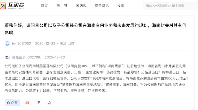 鹭燕医药是一家总部在福建厦门的医药流通企业,主营业务为药品、中药饮片、医疗器械等分销及医药 零售连锁,主要收入来源为医药批发销售收入。 在市场看来,鹭燕医药股价上涨背后,跟搭上"海南封关"的风口有关,但这背后是概念炒作还是另有其 他? 【#海南封关带火鹭燕医药股价#,#鹭燕医药海南地区收入不到3%#】1月6日,福建药企鹭燕医药 (002788.SZ)股价再度涨停。在2025年12月,公司股价累计涨幅已翻倍。 鹭燕医药2025年12月23日在深交所的互动易上表示,公司于2023年9月对海南鹭燕(控股子公司)增 资,将海南鹭燕的注册资本由3500万元增至1亿元,用于满足海南鹭燕经营发展及"鹭燕医药海南总部基 地项目"建设需要。海南封关,将为公司医药产品跨境流通业务提供助力。公司将全力以赴,拓展业 务,提升业绩,回报投资者。 根据鹭燕医药2025年半年报,2025年上半年,公司实现营业总收入104亿元,同比增长0.91%;归属于 上市公司股东的净利润1.55亿元,同比下降18.83%。从地区收入来源看,公司来自福建省的收入占公司 整体收入近七成,为72.76亿元,之后是四川省和江西省,收入分别为18.01亿元、9. ...
