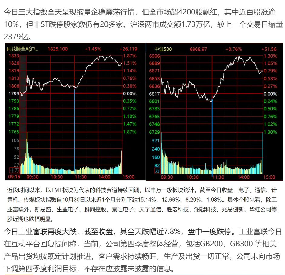 今日三大指数全天呈现缩量企稳震荡行情,但全市场超4200股飘红,其中近百股涨逾 10%,但非ST跌停股家数仍有20多家。沪深两市成交额1.73万亿,较上一个交易日缩量 2379亿。 ①高盛首席中国股票策略师刘劲津日前表示,AI引领的中国股票上涨远非泡沫,因为中国科技公司仍有空间 通过专注于AI应用来提升估值和盈利; 2他表示,中国股票的牛市行情将延续,全球投资者越来越愿意探索中国市场的投资机会。 财联社11月24日讯(编辑 卞纯) 高盛首席中国股票策略师刘劲津日前表示,人工智能(AI)引领的中国股票上涨 远非泡沫,因为中国科技公司仍有空间通过专注于AI应用来提升估值和盈利。 刘劲津上周晚些时候在接受媒体采访中表示,与美国专注于算力的战略不同,中国将更多资金投向人工智能应用 领域,这让投资者 "有理由相信,至少在短期内,中国AI的商业化变现能力可能更强"。 今日工业富联再度大跌,截至收盘,其全天跌幅近7.8%,盘中一度跌停。工业富联今日 在互动平台回复提问称,当前,公司第四季度整体经营,包括GB200、GB300 等相关 产品出货均按既定计划推进,客户需求持续畅旺,生产及出货一切正常。公司未向市场 下调第四季度 ...