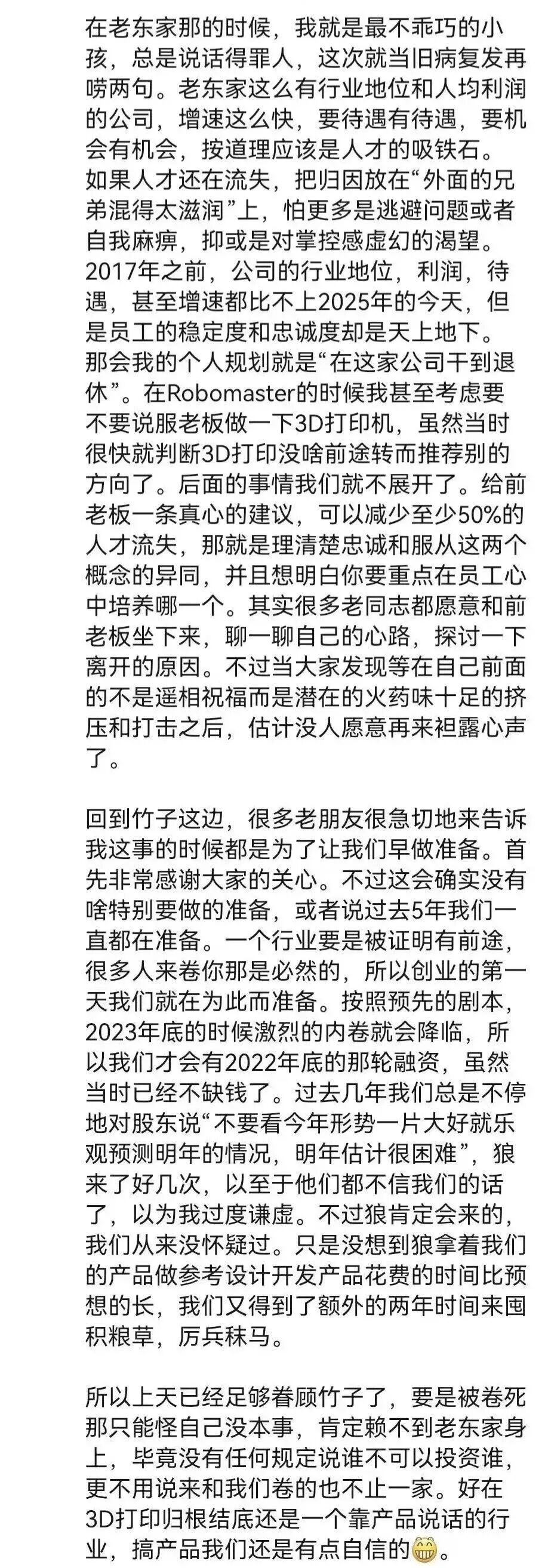 上周末,拓竹科技创始人陶冶发布的上千字朋友圈截图被公开传播。 该帖文称"老东家投了一家3D打印公司,协议里面还特别安排了拓竹相关的条款"。21世纪经济报道记 者从多个渠道证实了该帖文的真实性。 这也是近期第二个在社交媒体公开发文的科技企业创始人,上一个是市值超1000亿的影石创新 (688775.SH)创始人刘靖康。 大疆公司回应21世纪经济报道记者表示,大疆投资3D打印公司信息属实。本次投资是基于其对消费级 3D打印技术发展潜力、行业增长潜力的看好,符合大疆对创新科技一贯的理念和前瞻性布局。 市场传言称,大疆投资的3D打印企业为智能派。不过,大疆回应中没有点名被投资方。另据天眼查, 智能派目前没有股权变更的相关信息,公司公开的融资记录还停留在2022年的A轮。 在2020年创立拓竹科技前,陶冶在大疆有一段8年的工作经历,原先是大疆消费级无人机事业部负责 人,后创业选择了3D打印这个当时看起来不太性感的赛道,如今迎来爆发。 近年来,3D打印逐渐从一个小而美的赛道,走进寻常百姓家。 目前,消费级3D打印机价格较三年前下降了60%,入门仅需2000元以内,各家生态社区模型逐渐完 善,以Hitem3D为代表的AI工 ...