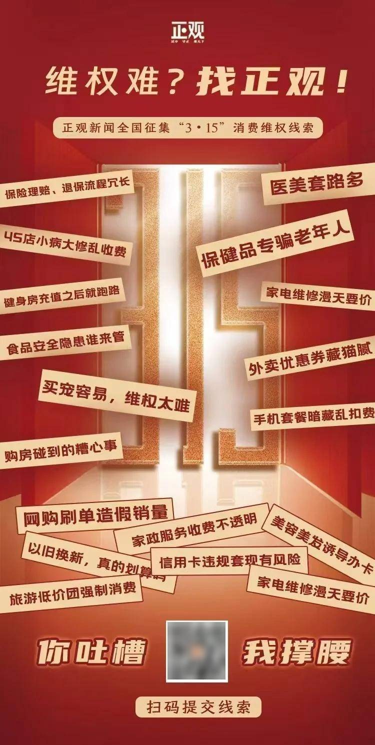 2026年3·15国际消费者权益日来临之际,正观新闻面向全国征集消费维权线索,聚焦消费领域各类乱象, 深挖侵权问题根源,助力打造安全、放心、舒心的消费环境,让消费者敢消费、愿消费、乐消费。 在"激发消费活力"成为全社会共识、消费高质量发展成为时代主旋律的今天,一个透明、诚信、法治、健 康的消费环境,是让每一位消费者敢消费、愿消费、放心消费、乐享高品质消费的根本基石。 如果您曾买到假冒伪劣产品维权无门; 如果您曾被虚假宣传误导、蒙受财产损失; 如果您曾遭遇价格欺诈、霸王条款、售后推诿; 如果您正被各类消费套路层层困扰、有苦无处诉—— 现在,您的困扰,我们倾听;您的权益,我们守护! 线索征集方式: 扫描海报上的二维码,直接跳转至线索提交页面。 清晰完整的消费经过描述、相关证据(合同、票据、支付记录、聊天截图、照片、视频、录音等)及您的 联系电话。 我们郑重承诺: 对所有线索提供者的个人信息严格保密,全程保护您的隐私安全。 请尽可能提供: 在正观新闻,每天都是3·15。 我们坚持"居中、守正、观天下",不止于集中曝光,更致力于长效守护;不止于揭露乱象,更致力于推动 解决。 维权期间,我们将直击消费陷阱、深挖行业潜规 ...