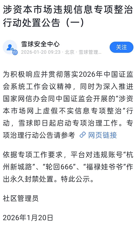 1月20日,雪球安全中心发布涉资本市场违规信息专项整治行动处置公告(三),为积极响应并贯彻落 实2026年中国证监会系统工作会议精神,同时为深入推进国家网信办会同中国证监会开展的"涉资本市 场网上虚假不实信息专项整治"行动,雪球即日起启动专项治理工作。依据专项工作要求,平台对违规 账号"疯狂梭哈哥"、"财运到提钱买房"、"风之杂谈"、"西南板王"、"Johnson00"、"逆光飞翔G大"、"老 余看股市"、"小雪豹旁边的小甲贺"、"ST张校长"、"幸运公主小甜甜"、"少先队长王元鹅"作出永久封 禁处置。 ...