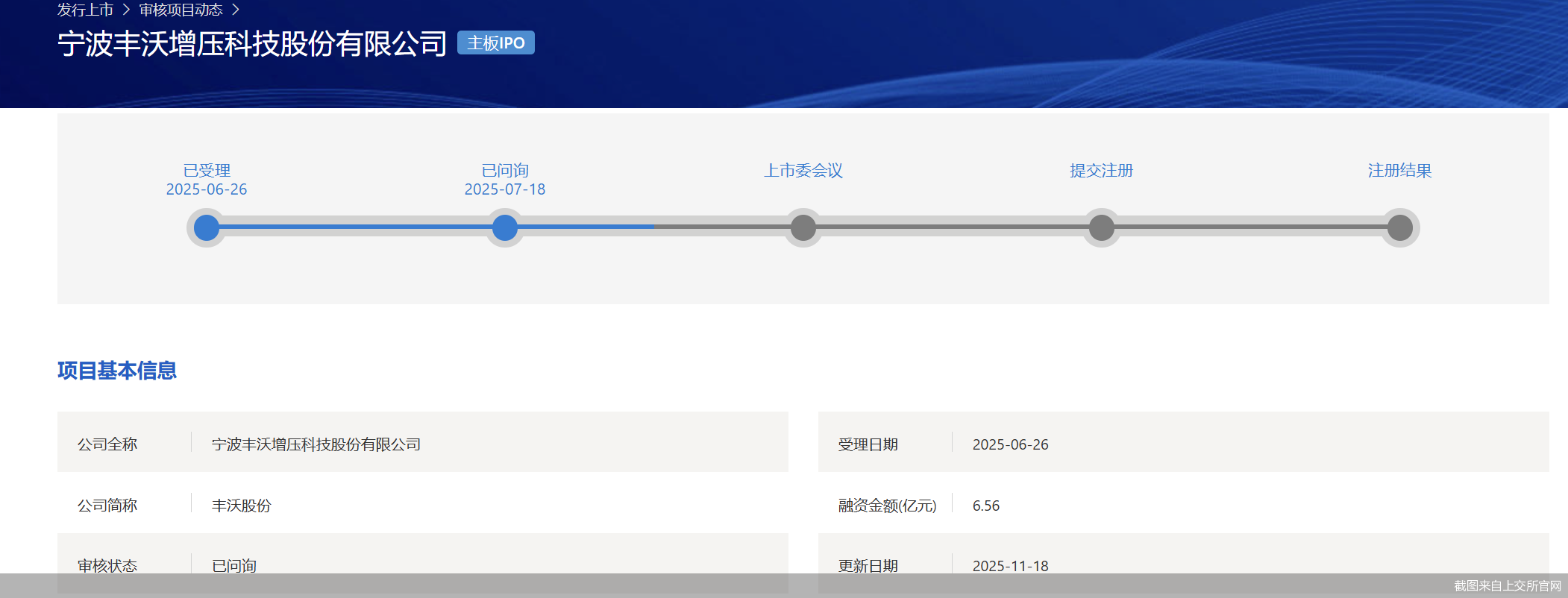 由吉利控股集团董事长李书福一双儿女掌舵,宁波丰沃增压科技股份有限公司(以下简称"丰沃股份")的冲A事项迎来最新进展。近期,公司沪市主板IPO 更新披露招股书,并对外披露了首轮审核问询函回复。值得关注的是,在本次冲击上市背后,公司主要产品涡轮增压器的销售价格逐年下降。另外,从最新 披露的2025年上半年数据来看,公司上半年向前五大客户销售占比超九成,而超三成均来自吉利控股集团及与其同属于同一控制下的主体(以下简称"吉利 集团")。 | 公司全称 | 宁波丰沃增压科技股份有限公司 | | --- | --- | | 公司简称 | 丰沃股份 | | 审核状态 | 已问询 | 近期,丰沃股份主板IPO交出了首轮审核问询"答卷"。据了解,丰沃股份主营业务为涡轮增压器的研发、制造及销售,并向电动增压器、空气悬架核心零部 件领域拓展。公司主板IPO于2025年6月26日获得受理,当年7月18日进入问询阶段。 本次冲击上市,丰沃股份拟募集资金约6.56亿元,其中1.08亿元拟用于补充流动资金,其余募集资金则拟分别用于年产100万套涡轮增压器项目、年产60万套 空气悬架零部件项目。不过值得一提的是,在计划募资补流的同时,丰沃股 ...