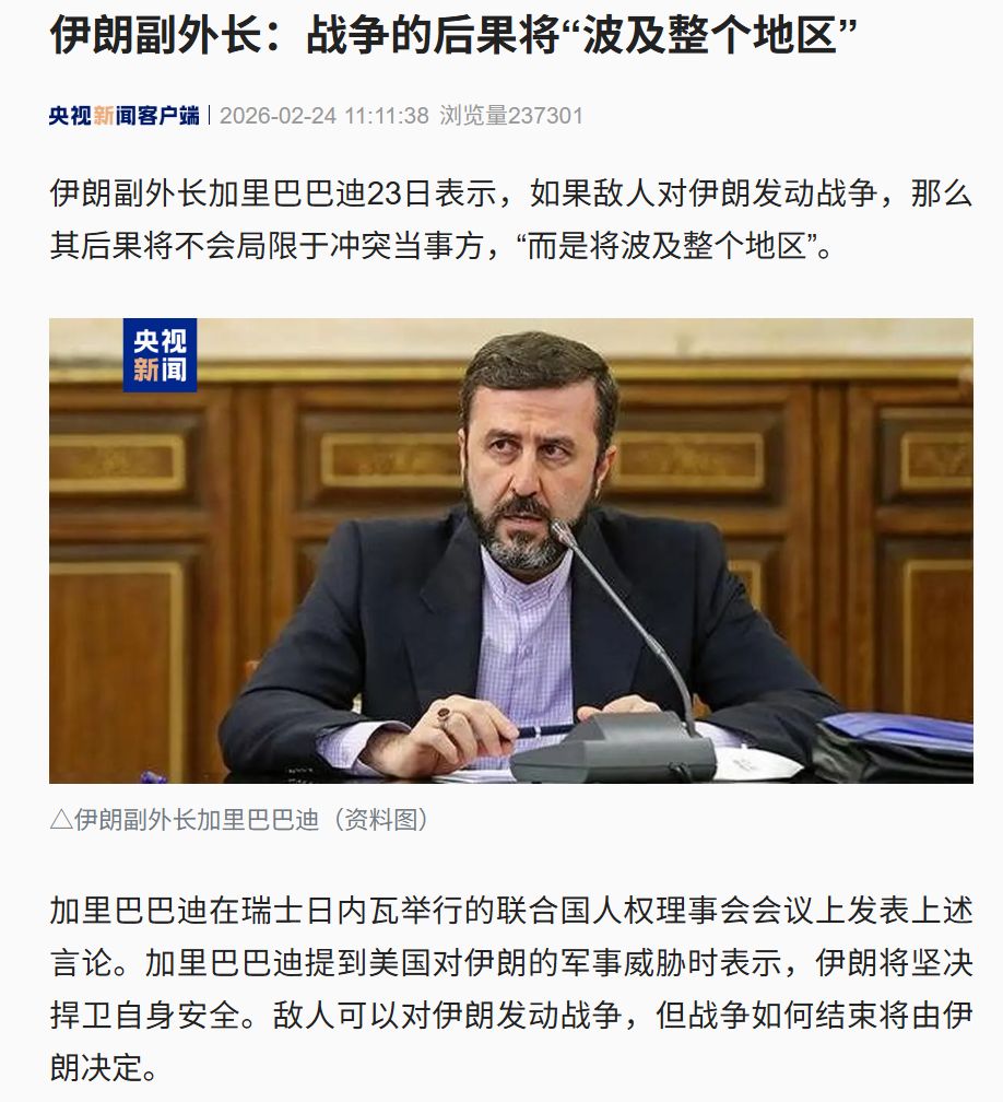 另据伊朗塔斯尼姆通讯社报道,伊朗伊斯兰共和国军队总司令哈塔米23日说,有人企图通过战略手段削 弱伊朗。伊朗武装部队将"战斗到最后一刻",捍卫伊朗主权和领土完整。 哈塔米当天在伊朗伊斯兰共和国军队指挥和参谋大学毕业典礼上发表讲话时说,敌人对伊朗的威胁涵盖 政治、经济、社会、军事和心理等多个领域,是更广泛的混合战争的一部分。伊朗武装部队必须做好应 对混合战争的准备。 哈塔米以美军在他国的失败军事干预为例说,外部势力以威胁和恐吓为手段"入侵"伊朗,但最终都会以 失败告终。 阿曼外交大臣巴德尔22日确认,美国和伊朗新一轮谈判定于26日在瑞士日内瓦举行。美国和伊朗第二轮 间接谈判17日在日内瓦举行。美伊官员在谈判结束后均表示,尽管分歧仍存,但谈判较上一轮取得进 展,双方同意继续接触。与此同时,美国近期在中东地区大规模集结兵力。美国总统特朗普近日承认, 他在考虑对伊朗进行"有限军事打击"。 来源:沙达提、陈霄/新华社 据伊朗迈赫尔通讯社23日报道,伊朗副外长加里巴巴迪当天表示,如果敌人对伊朗发动战争,那么其后 果将不会局限于冲突当事方,"而是将波及整个地区"。 加里巴巴迪在瑞士日内瓦举行的联合国人权理事会会议上发表上述言 ...