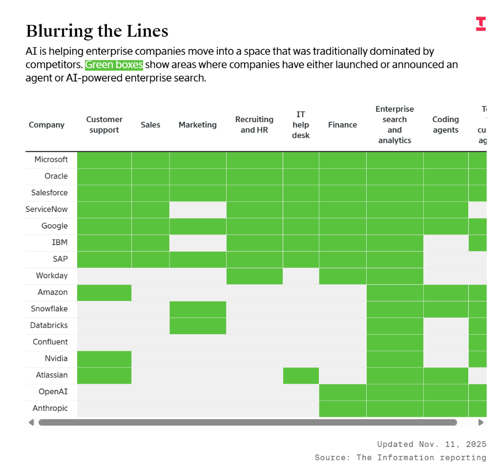 企业软件行业正陷入一场前所未有的混战,传统市场边界被人工智能彻底打破。 从数据库巨头Snowflake到客户关系管理(CRM)领导者Salesforce,几乎所有主要的技术公司都在竞相推出功能相似的通用AI代理),将昔日的 合作伙伴推向了直接竞争的舞台,这既创造了巨大的增长机遇,也带来了关乎存亡的挑战。 这一趋势的最新动态是,原本业务泾渭分明的公司正在相互渗透核心市场。Salesforce,一家主营客户关系软件的公司,最近推出了用于解决IT帮 助台问题的AI代理。与此同时,IT服务管理软件公司ServiceNow则反向推出了面向销售人员的AI代理。数据库服务商Snowflake上月也发布了其AI 代理产品,宣称能够处理从销售到财务等多种专业岗位的任务。 这场AI代理的"军备竞赛"在企业客户中引发了显著的困惑。由于各家产品功能高度重叠,企业买家在选择时面临"极其困难"的局面,部分公司因 此推迟了大规模采购决策。这种混乱局面恰恰反映了赌注之高,正如Snowflake首席执行官Sridhar Ramaswamy所言,软件公司在这场变革中"要么 走向万亿美元市值,要么归零"。 这一现象也直接呼应了近期市场对"所有软件 ...