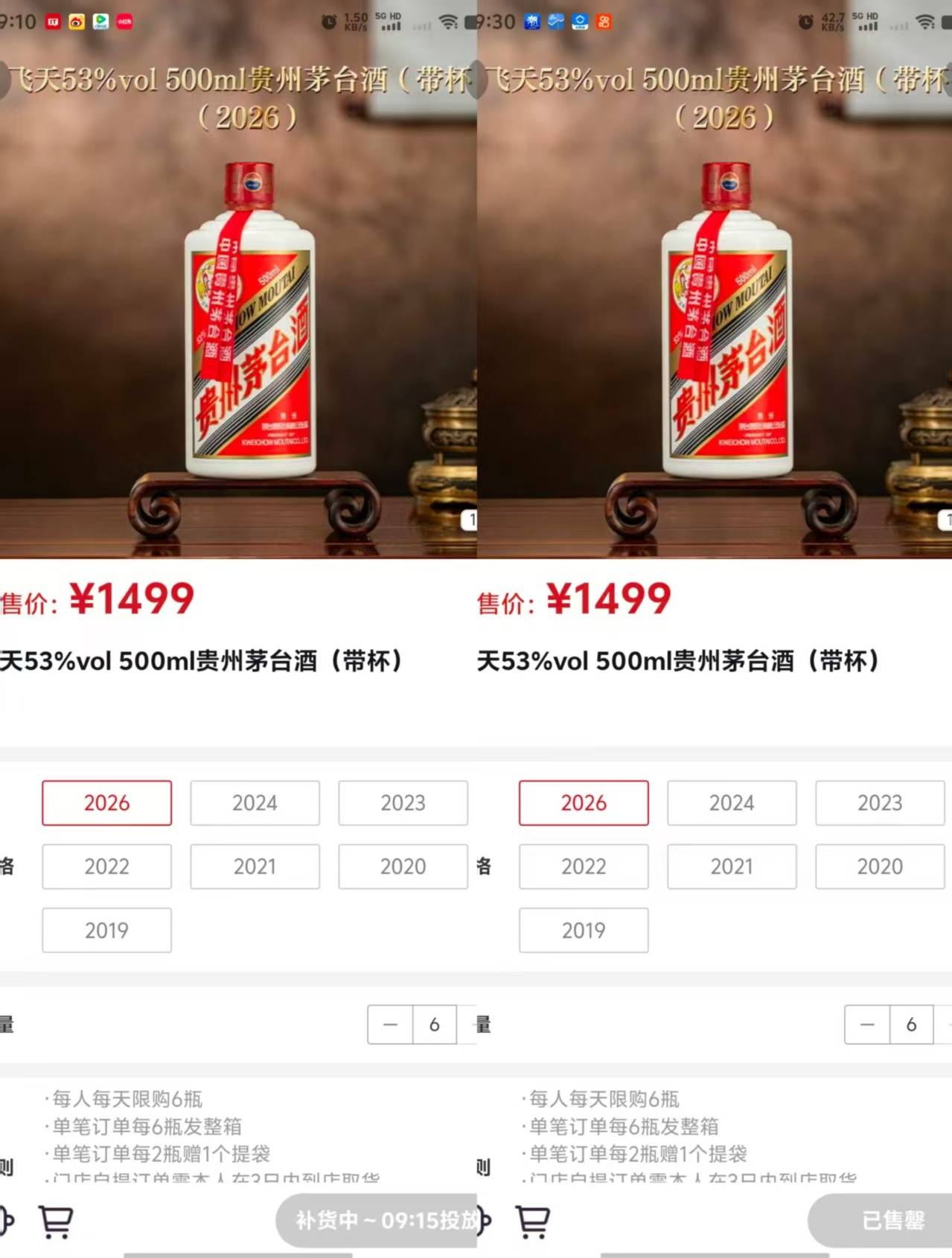 央广网北京1月6日消息(记者 孙文轩)1月6日上午,根据官方公布的供货时间,记者在i茅台平台尝试抢购飞天53%vol 500ml贵州茅台酒(2026)(即市场 俗称的'飞天茅台'或'普茅'),9:00至9:30期间,页面多次显示"补货中……5分钟后投放",但始终未能成功下单。9时30分,页面显示"已售罄"。 至此,53%vol 500ml飞天茅台在i茅台常态化上线已进入第六天,仍保持"上架即售罄"的热度。同日,贵州茅台酒(丙午马年)也于每日9时在该平台同步开 售,其经典版(1899元/瓶)和礼盒装(3789元/2瓶)同样迅速售罄。 此前,自1月1日起每日上架飞天茅台的i茅台平台,于1月3日晚宣布调整购买规则:为满足春节前需求,1月4日至春节期间,用户单日购买上限由12瓶调整 为6瓶。平台同时透露,元旦假期三天已有超10万名用户通过平台完成购买。 业内人士认为,核心产品全面上线直销平台,标志着茅台渠道改革与终端管控迈出关键一步。这一举措在直接面向终端消费者的同时,也对传统经销渠道的 价格体系产生了直接影响。市场数据显示,飞天茅台的散瓶批发价一度跌破1499元官方指导价。 1月6日上午9时许,央广网记者数次在i茅 ...
