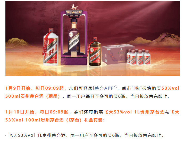 【导读】1499买飞天茅台,每人每天限购12瓶 中国基金报记者 泰勒 大家好,茅台放大招了! (资料图片仅供参考) 2026年的第一天,上午 9时起,每人每日可在i茅台购买12瓶飞天茅台酒! 12月31日晚间,据"贵州茅台"官方消息, 2026年1月1日起,i茅台APP焕新改版,将原有的"享约·申 购"与"畅享·云购"整合升级为统一的"i购"入口。在"i购"页面,用户可直接购买所有i茅台APP的在售商 品。 1月1日上午9时,飞天53%vol 500ml贵州茅台酒(2026)将正式发售,每位用户目前每日最多可购买12 瓶。每日投放量会综合考虑防止炒作、供需适配和市场稳定确定,当日售完即止。之后,每日上午9时 准点开售。 其中上架的产品包括,贵州茅台酒经典系列: 飞天53%vol 500ml贵州茅台酒(2026) 飞天53%vol 500ml贵州茅台酒(2024) 飞天53%vol 500ml贵州茅台酒(2023) 飞天53%vol 500ml贵州茅台酒(2022) 飞天53%vol 500ml贵州茅台酒(2021) 飞天53%vol 500ml贵州茅台酒(2020) 飞天53%vol 500ml贵州茅台酒(2 ...