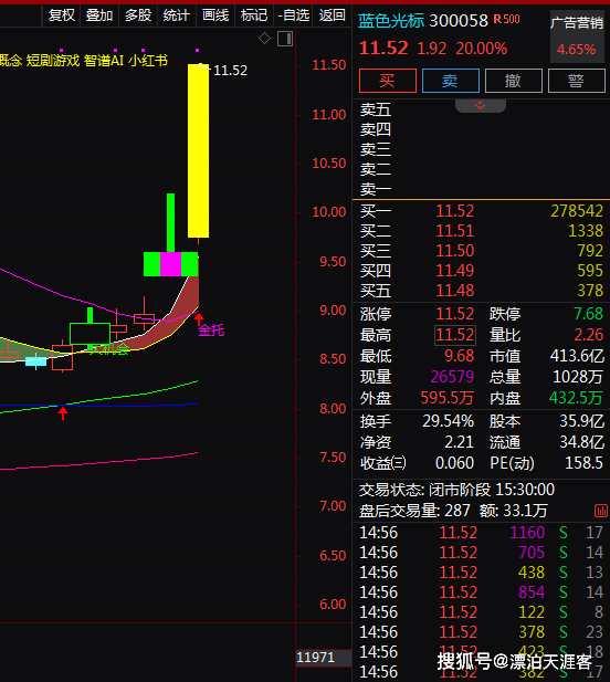 一、热门个股解读——蓝色光标(300058) | 复权 叠加 多股 统计 | 画先 | 标记 -自选 返回 | | 蓝色光标 300058 R500 | | 告营销 | | --- | --- | --- | --- | --- | --- | --- | | | | < | | 11.52 1.92 20.00% | | 4.65% | | 年1 · 「 | 11.52 | 11.50 | | | | | | | | | ਲੇ | 英 | 撒 | 해 | | | | 11.00 | ब्रेन | | | | | | | | 英四 | | | | | | | 10.50 | 第二 | | | | | | | | 能 | 11.52 | | 278542 | | | | 10.00 | 지 지 독 | | | | | | | | | 11.51 | | 1338 | | | | 9.50 | | 11.50 | | 792 | | | | | 买四 | 11.49 | | ટેવેટ | | | | | 采 | 11.48 | | 378 | | | | 9.00 | 涨停 | 11.52 | 跌停 | 7. ...