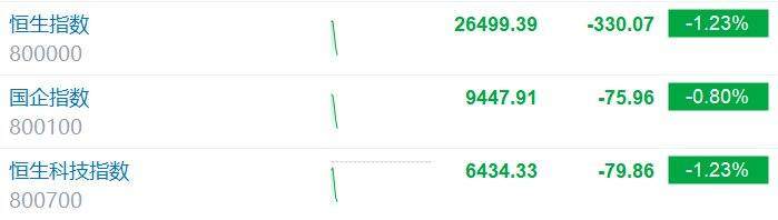 (责任编辑:宋政 HN002) 【免责声明】本文仅代表作者本人观点,与和讯网无关。和讯网站对文中陈述、观点判断保持中立,不对所包含内容 的准确性、可靠性或完整性提供任何明示或暗示的保证。请读者仅作参考,并请自行承担全部责任。邮箱: news_center@staff.hexun.com 格隆汇10月9日|港股高开低走,恒生指数、恒生科技指数跌幅扩大至逾1%。创新药、加密货币概念股 领跌大市。 | 恒生指数 | 26499.39 | -330.07 | -1.23% | | --- | --- | --- | --- | | 800000 | | | | | 国企指数 | 9447.91 | -75.96 | -0.80% | | 800100 | | | | | 恒生科技指数 | 6434.33 | -79.86 | -1.23% | | 800700 | | | | ...