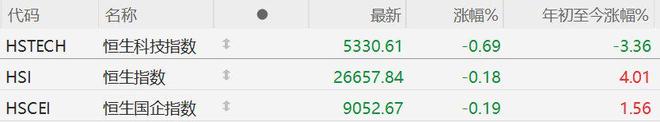 | 代码 | 名称 | . | 最新 | 涨幅% | 年初至今涨幅%。 | | --- | --- | --- | --- | --- | --- | | HSTECH | 恒生科技指数 | 1 | 5330.61 | -0.69 | -3.36 | | HSI | 恒生指数 | 1 | 26657.84 | 100 Carola -0.18 | 4.01 | | HSCEI | 恒生国企指数 | 1 | 9052.67 | -0.19 | 1.56 | 来源:格隆汇APP 格隆汇2月20日|港股三大指数集体低开,恒生科技指数跌0.69%,恒生指数跌0.18%,国企指数跌 0.19%。 ...