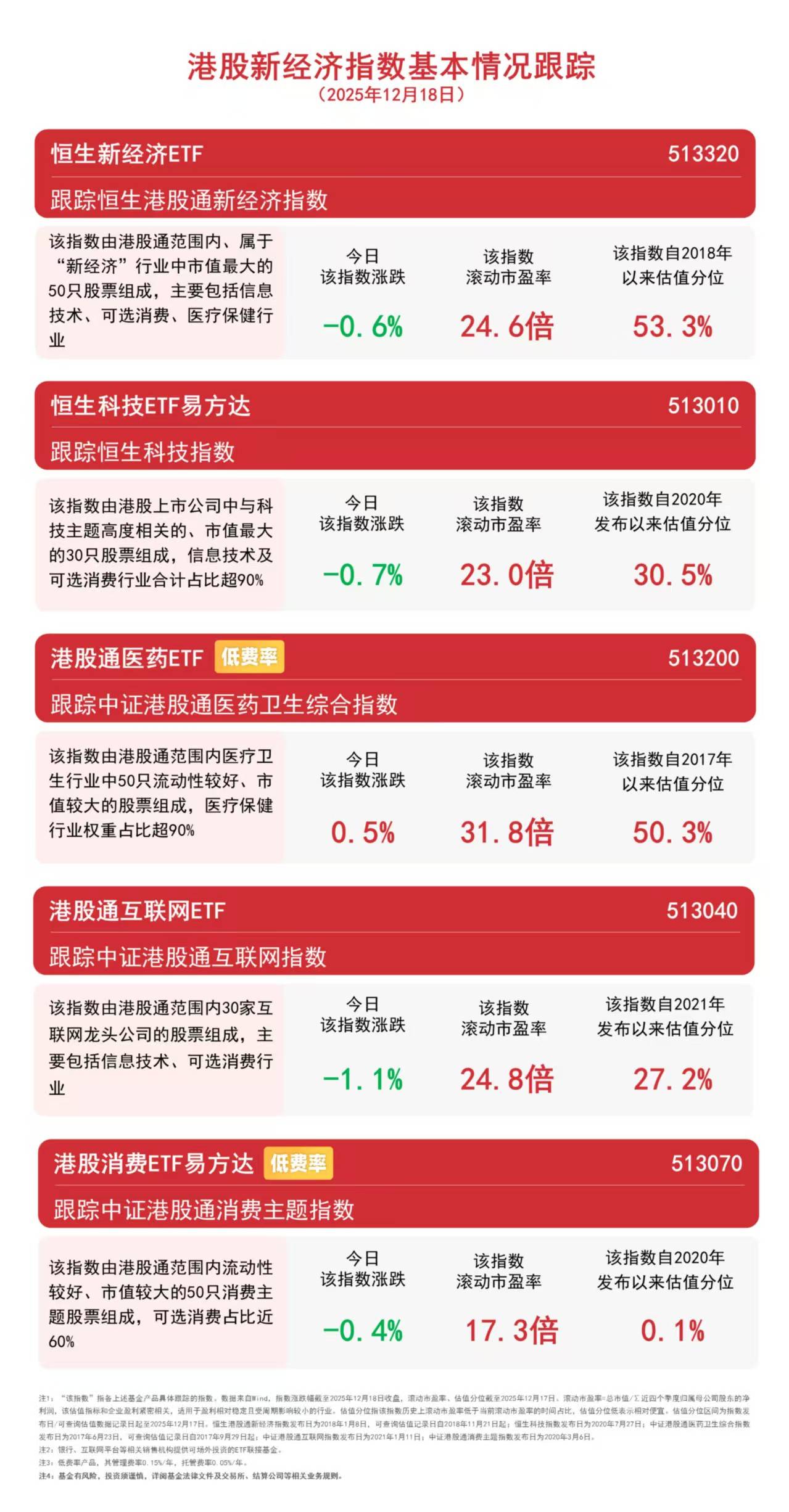港股今日震荡分化,午后小幅回暖,医药、能源,银行股领涨,科技股微跌,截至收盘,中证港股通医药卫生综合指数上涨0.5%,中证港股通消费主题指 数下跌0.4%,恒生港股通新经济指数下跌0.6%,恒生科技指数下跌0.7%,中证港股通互联网指数下跌1.1%。Wind数据显示,截至昨日,恒生科技ETP易方 达(513010)月内资金净流入额超20亿元、居同类前列。 港股新经济指数基本情况跟踪 (2025年12月18日) 恒生新经济ETF 跟踪恒生港股通新经济指数 该指数由港股通范围内、属于 "新经济"行业中市值最大的 50只股票组成,主要包括信息 技术、可选消费、医疗保健行 s | 今日 | 该指数 | 该指数自 | | --- | --- | --- | | 该指数涨跌 | 滚动市盈率 | 以来估1 | | -0. 6% | 24. 6倍 | 53. | 恒生科技ETF易方达 跟踪恒生科技指数 该指数由港股上市公司中与科 技主题高度相关的、市值最大 的30只股票组成,信息技术及 可选消费行业合计占比超90% | や日 | 该指数 | | --- | --- | | 该指数涨跌 | 滚动市盈率 | | -0. 7% | ...