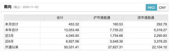 Core Insights - Southbound funds through the Hong Kong Stock Connect recorded a net purchase of HKD 66.54 billion on November 10, marking a year-to-date net inflow exceeding HKD 1.3 trillion, and the cumulative net inflow since the launch of the Stock Connect has surpassed HKD 5 trillion, setting a new record since the interconnection mechanism was established [1] Summary by Categories Monthly and Yearly Performance - Total net purchases for the month reached HKD 453.32 billion, with HKD 160.53 billion from the Shanghai Stock Connect and HKD 292.79 billion from the Shenzhen Stock Connect [2] - Year-to-date total net purchases stand at HKD 13,053.49 billion, with HKD 7,735.22 billion from the Shanghai Stock Connect and HKD 5,318.27 billion from the Shenzhen Stock Connect [2] Recent Trends - In the last three months, net purchases amounted to HKD 4,045.50 billion, with HKD 1,754.66 billion from the Shanghai Stock Connect and HKD 2,290.83 billion from the Shenzhen Stock Connect [2] - Over the past six months, total net purchases reached HKD 6,927.56 billion, with HKD 3,549.36 billion from the Shanghai Stock Connect and HKD 3,378.20 billion from the Shenzhen Stock Connect [2] Historical Data - Since the launch of the Stock Connect, cumulative net inflows have reached HKD 50,031.41 billion, with HKD 27,927.31 billion from the Shanghai Stock Connect and HKD 22,104.10 billion from the Shenzhen Stock Connect [2]