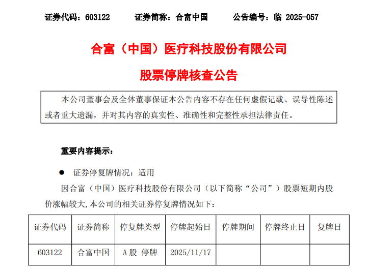 【导读】合富中国宣布将停牌核查 中国基金报记者 忆山 股价大涨 256% 后, 11 月 14 日,合富中国宣布将停牌核查,预计停牌时间不超过 3 个交 易日。 | 证券代码 | 证券简称 | 停复牌类型 | 停牌起始日 | 停牌期间 | 停牌终止日 复牌日 | | --- | --- | --- | --- | --- | --- | | 603122 | 合富中国 | A 股 停牌 | 2025/11/17 | | | 根据公告,合富中国股票于 10 月 28 日至 11 月 14 日期间,连续十四个交易日中有十二个 交易日以涨停价收盘,并 5 次触及股价异常波动, 3 次触及严重异常波动情形,股价累计涨 幅 高 达 2 5 6.2 9 % 。 1 1 月 1 4 日 , 公 司 股 价 继 续 大 幅 上 涨 , 盘 中 一 度 触 及 涨 停 , 换 手 率 高 达 2 8.4 8 % 。 | 买入金额最大的前5名 | | | | | | | | | | --- | --- | --- | --- | --- | --- | --- | --- | --- | | 序号 | 交易营业部名称 | | | ...