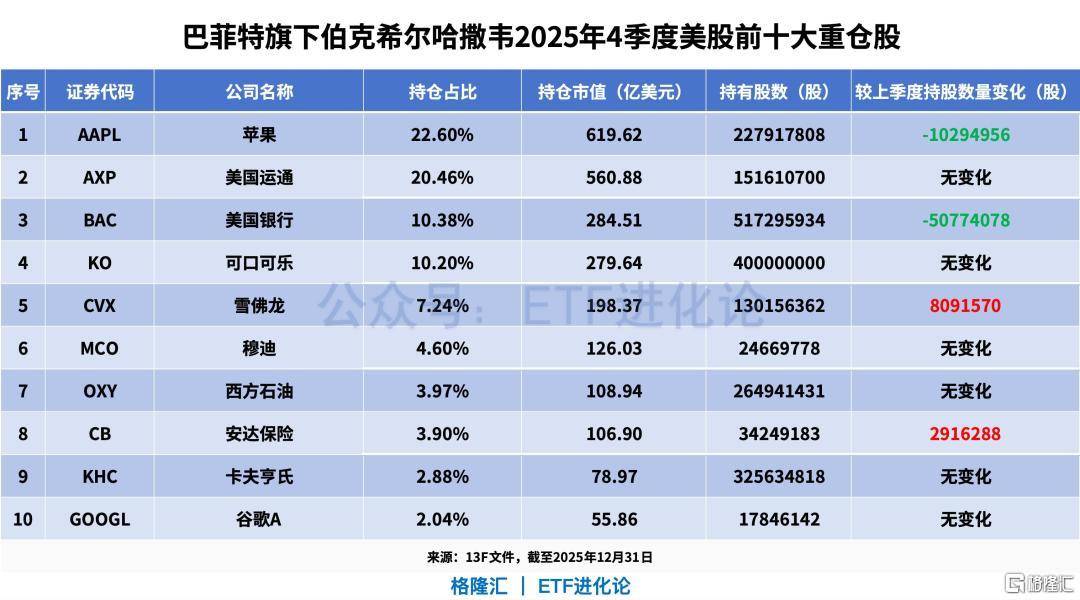 巴菲特最新动向来了! 伯克希尔向美国证监会提交了2025年四季度13F文件。 这份文件激起的涟漪,远比数字本身要深沉得多。 六十年光阴落笔成章,2026年1月1日,Greg Abel将正式接任CEO。 这是伯克希尔在巴菲特执掌下的最后一份13F报告。 巴菲特的这份收官之作,其持仓变动之诡谲,确实意味深长。。 再出手!继续减持重仓股。 从最新动向看,巴菲特减持5077万股美国银行,伯克希尔对美国银行的持股从2024年中的10.3亿股降至5.17亿股,减持约50%。与此同时,伯克希尔连续 三个季度削减苹果仓位,并在四季度大幅减持了亚马逊。 这种撤退,发生在美股屡创新高、AI浪潮如火如荼的背景下,显得格外令人惊诧——当全市场都在为每一个百分点的涨幅欢呼时,这位九十六岁的老人 却在有条不紊地走向出口。 在增持方面,四季度巴菲特依旧表现得极度保守。 伯克希尔仅仅小幅加仓了雪佛龙、安达保险、达美乐比萨与拉马尔户外广告。 四季度,唯一的新动作——建仓纽约时报,买入506.7万股,市值3.52亿美元。 截至2025年末,前十大重仓股依旧是那些熟悉的老面孔:苹果、美国运通、美国银行、可口可乐、雪佛龙、穆迪、西方石油、瑞士安达保 ...